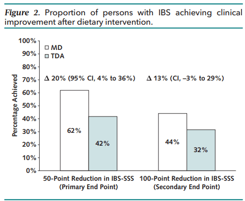 Methods: Randomized noninferiority clinical trial (n=139 Adults from UK) — 6 weeks of the MD (Mediterranean diet) (n = 68) versus TDA (traditional diet advice) (n = 71). Primary end point was the proportion achieving clinical response, defined as 50-point or greater reduction in IBS Symptom Severity Scale (IBS-SSS).