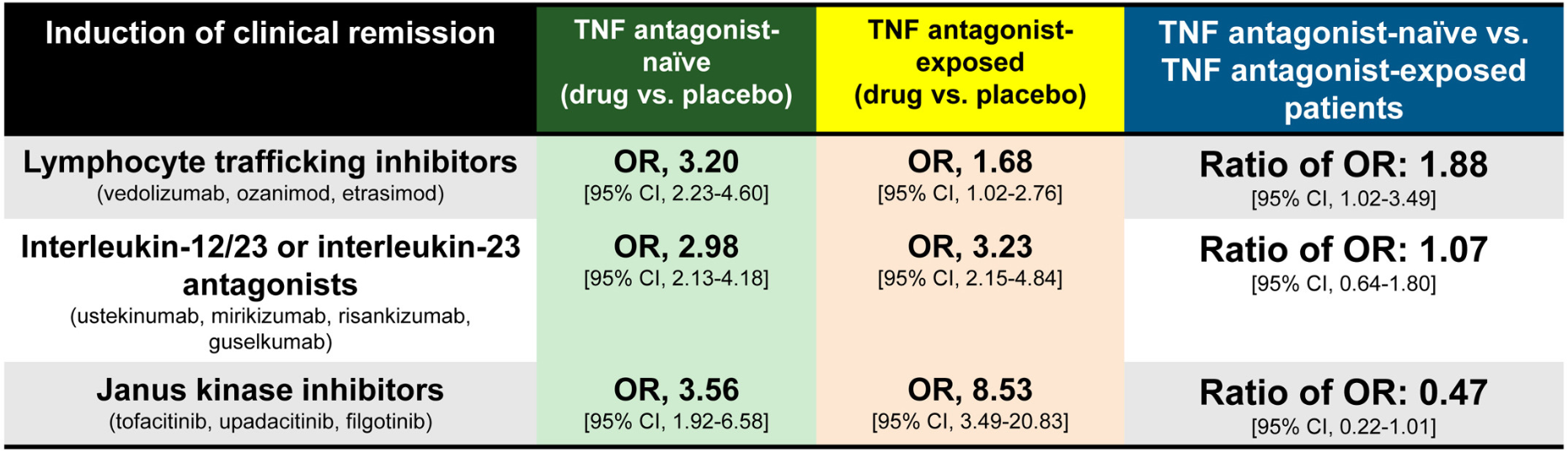 Methods: Meta-analysis of 17 randomized controlled trials in 8871 adults with moderate-severe UC. The authors calculatedthe ratio of odds ratio of achieving remission with active drug vs placebo, in TNF antagonist–naïve vs TNF antagonist–exposed patients.