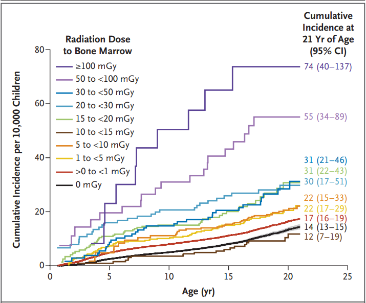 While the risks in aggregate appear quite substantial, the editorial (L Morton. NEJM 2025; 393; 1337-1339.Studying Cancer Risks Associated with Diagnostic Procedures –Interpret Wisely) makes the point that the risks for the individual are very small. “Fewer than 1% of youths in this study accumulated doses of 30 mGy or more from medical imaging and even at this exposure level, the excess cumulative incidence of hematologic cancers was low (25.6 per 10,000)…we need to ensure that all involved in medical imaging…wisely interpret the results…to understand the balance of the very small risks and the notable benefits of necessary imaging examinations to provide optimal patient care.”