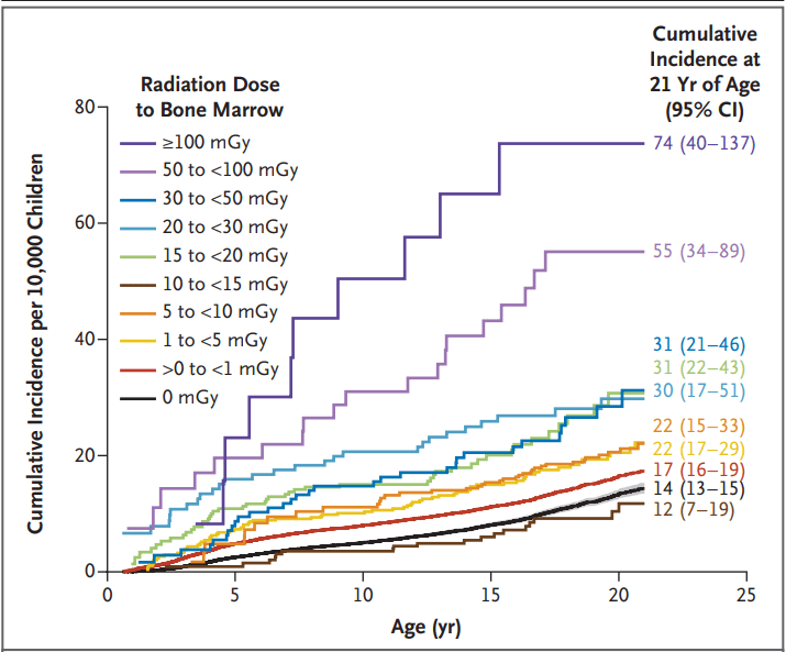The excess cumulative incidence of hematologic cancers by 21 years of age among children exposed to at least 30 mGy (mean, 57 mGy) was 25.6 per 10,000