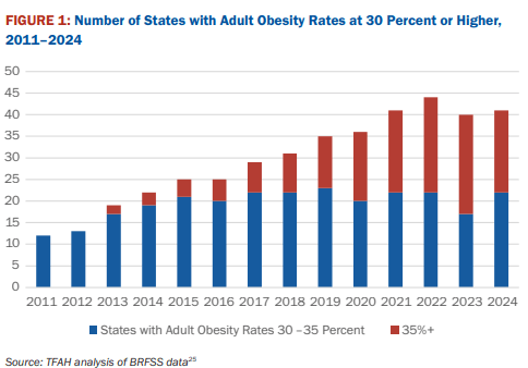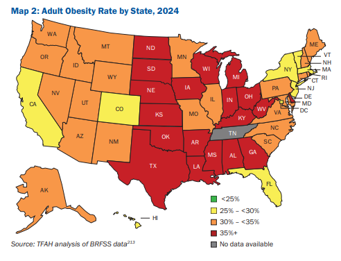 10/16/25 ABC News: Obesity remains high in the US., but more states showing progress, a new report finds “For the first time in more than a decade, the number of states with rates of obesity of 35% or more dropped, an encouraging sign that America’s epidemic of excess weight might be improving. But cuts to federal staff and programs that address chronic disease could endanger that progress, according to a new report released Thursday. Nineteen states had obesity rates of 35% or higher in 2024, down from 23 states the year before, according to an analysis of the latest data collected by the U.S. Centers for Disease Control and Prevention”