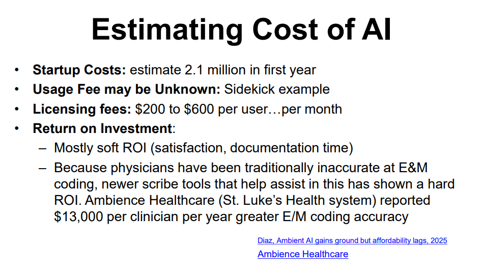 AI is teaching computers to think and predict problems. This can include analyzing radiology images, endoscopic findings (eg. polyps), interpreting EKGs, help with voice recognition, and scribe office visits (still in early stages)