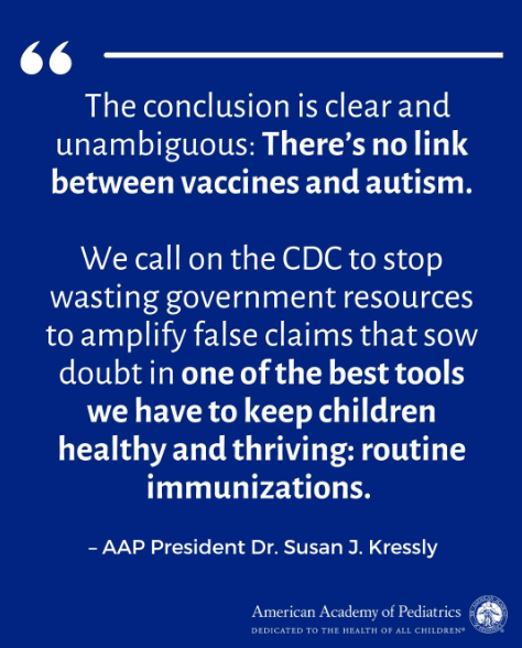 “The conclusion is clear and unambiguous: There’s no link between vaccines and autism,” Dr. Kressly said. “Anyone repeating this harmful myth is misinformed or intentionally trying to mislead parents.”