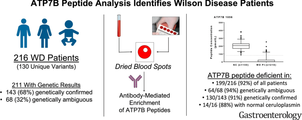 My take: “ATP7B peptide analysis identified WD patients in a large majority of cases and reduced ambiguities resulting from genetic analysis and Cp (ceruloplasmin) levels. This noninvasive assay can serve as an adjunctive test for the diagnosis of WD and is expected to fundamentally advance the use of proteomic technology for a rapid screening tool.