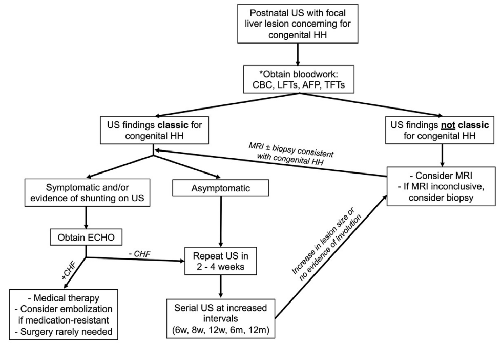 The practice algorithm for evaluation and management of congenital HH suggested by the authors. *Obtain baseline labs and repeat as needed. Repeat CBC if lesion increases in size during monitoring period and there is concern for intralesional bleeding. Repeat AFP as necessary to rule out hepatoblastoma. TFTs indicated if unclear whether congenital HH or infantile HH .