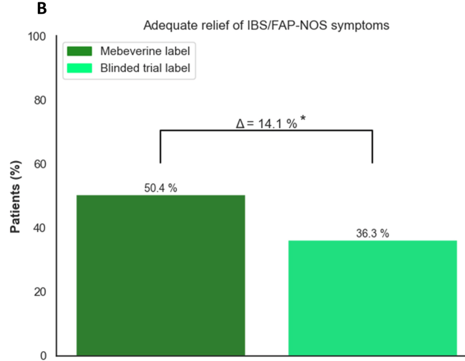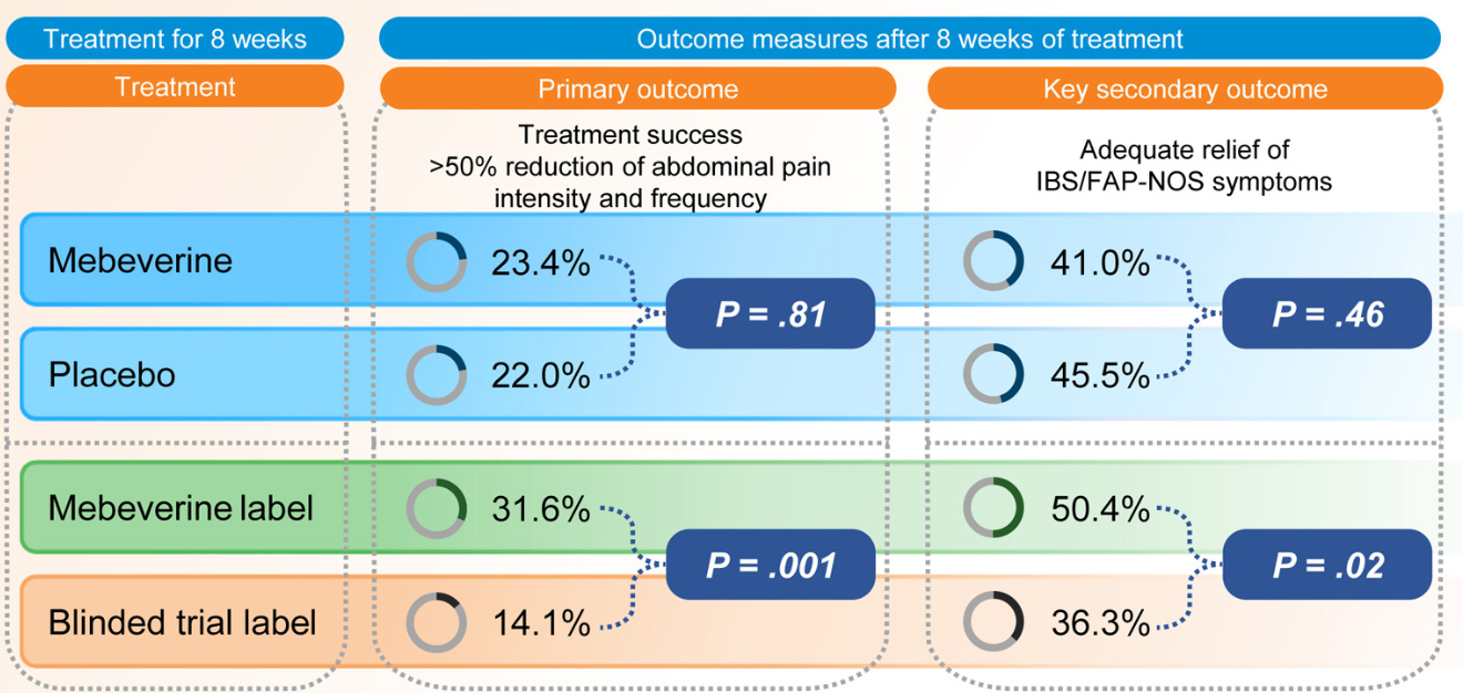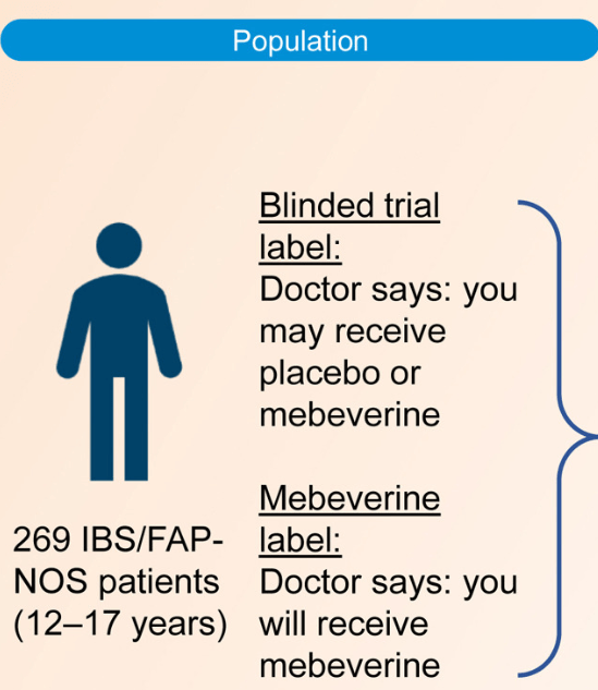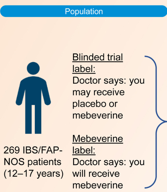 Methods: This was a randomized trial with 12-17 yr olds with irritable bowel syndrome or functional abdominal pain who received mebeverine (200 mg twice daily) or placebo for 8 weeks. Treatment was labeled as “mebeverine or placebo” (blinded trial label) or “mebeverine” (mebeverine label), creating the following 4 groups: (1) mebeverine-blinded trial label, (2) mebeverine-mebeverine label, (3) placebo-blinded trial label, and (4) placebo-mebeverine label. Randomization (1:1:1:1) was masked to physicians, except for drug labeling. Primary end point was treatment success (>50% reduction of abdominal pain intensity and frequency) after 8 weeks. The key secondary end point was adequate relief of symptoms.