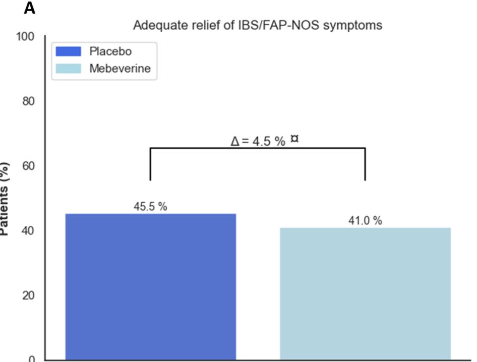Blinded Trial Label: Treatment success was similar between those receiving mebeverine (groups 1 and 2) (n = 31 [23.4%]) and placebo (groups 3 and 4) (n = 30 [22.0%]; odds ratio [OR], 1.08