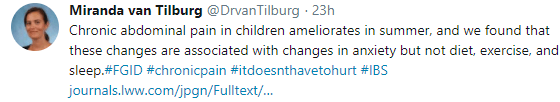 B Wynne et al. Gastroenterol 2019; 156: 935-45. This study showed that a psychological intervention termed “acceptance and commitment therapy (ACT)” was effective in a randomized controlled trial in reducing stress and depression in patients with quiescent or mildly-active IBD (n=122). With ACT, the “primary aim is to encourage subjects to adopt positive life values and to accept adverse experiences, including thoughts, feelings and sensations that are an inevitable consequence of life.” All program materials are available in article supplement: Full text and supplement: https://doi.org/10.1053/j.gastro.2018.11.030