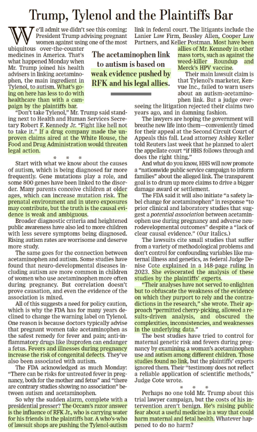 Editorial Board Wall Street Journal, 9/23/25: Trump, Tylenol and the Plaintiffs Bar “The acetaminophen link to autism is based on weak evidence pushed by RFK Jr. and his legal allies.”