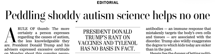 From TIME article: “Despite what we are now hearing from the most powerful health offices in the nation, the science on acetaminophen and autism remains unsettled. What is not unsettled is the damage done when politics masquerades as medicine. Every false certainty erodes the trust that holds the fragile bridge between patients and their doctors. Break that trust, and no study, no drug, no vaccine will be enough to save lives when the next real crisis comes. When politicians play doctor, it’s families who will pay the price.”