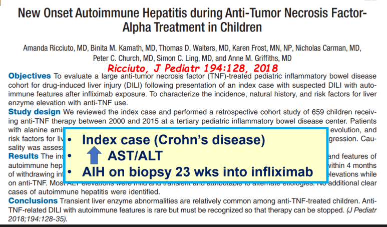 - Autoimmune Hepatitis Associated with Anti-TNF Therapy Serious liver injury related to anti-TNF therapy is rare. A great place to understand the spectrum of liver problems potentially related to infliximab is the livertox website