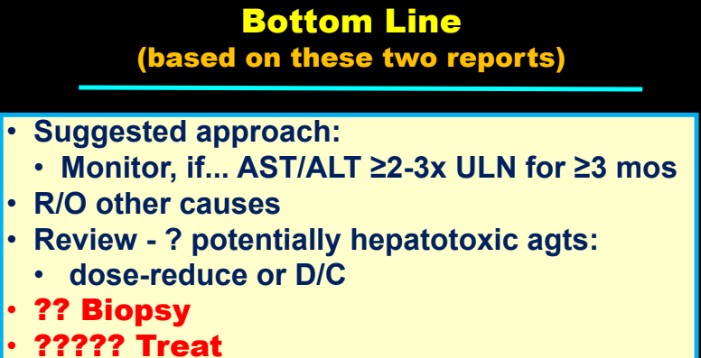 My take: While a randomized controlled trial would be better, this study demonstrates that infliximab is an option for AIH, especially in those with concurrent immune-mediated disorders and in those not responding to standard therapy. It is worth noting that infliximab can paradoxically induce an autoimmune hepatitis and stopping infliximab therapy can be curative in these patients (we recently had such a case).