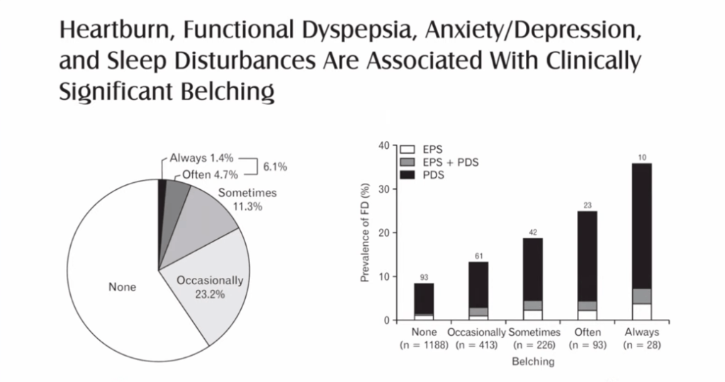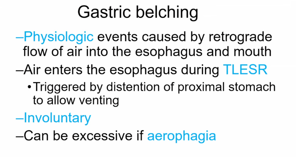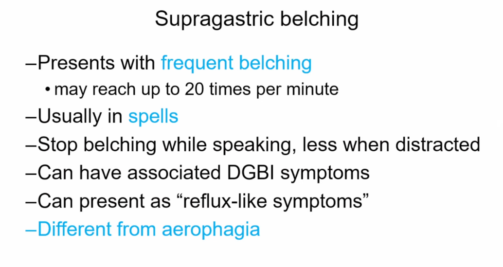 Belching or eructation can be divided into gastric belches which are normal and supragastric belching. Supragastric belching which is a behavior (not a reflex), is often provoked by stress. Air does not originate from the stomach or air swallowing (aerophagia). The most common mechanism: a contraction of the diaphragm causes negative pressure in the chest and allows air to be suctioned into the esophagus. It is expelled subsequently as a belch. In some instances, it can occur up to 20 times a minute. Supragastric belching does not occur during sleep and usually does not occur during speaking.