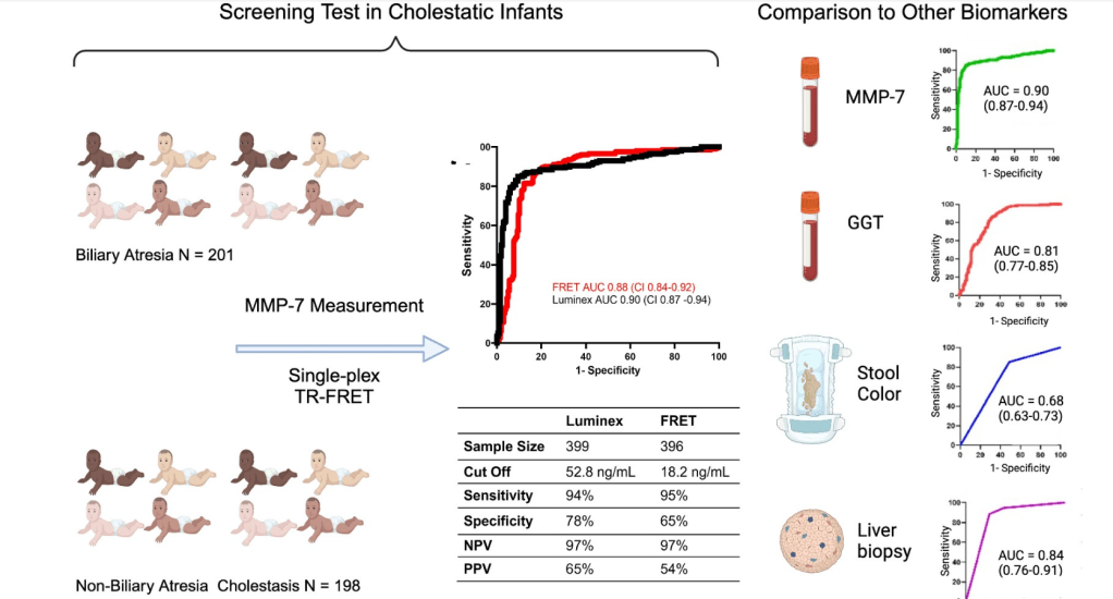 In the discussion, the authors note that MMP-7 has performed better in studies with Asian populations, MMP-7 could be useful for dried blood spots in newborns, and could be useful as a measure of successful HPE; continued elevation of MMP-7 has been associated with hepatic fibrosis.