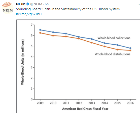 As noted in a previous blog, Business of Blood in Decline, the number of transfusions are declining. While this is good news, there are a number of worrisome trends that indicate a crisis in the sustainability of the U.S. blood system (HG Klein et al. NEJM 2017; 1485-8).