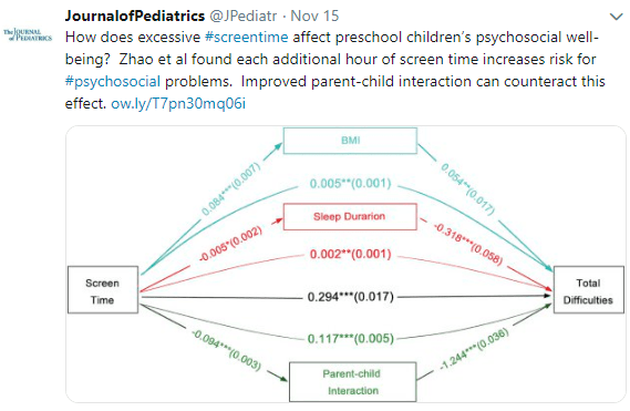- Every additional hour of screen time was associated with increased risk for poor psychosocial well-being; this effect on well-being had a number of mediators including reducing parent-child interaction as well as increased body mass index and reduced sleep duration.