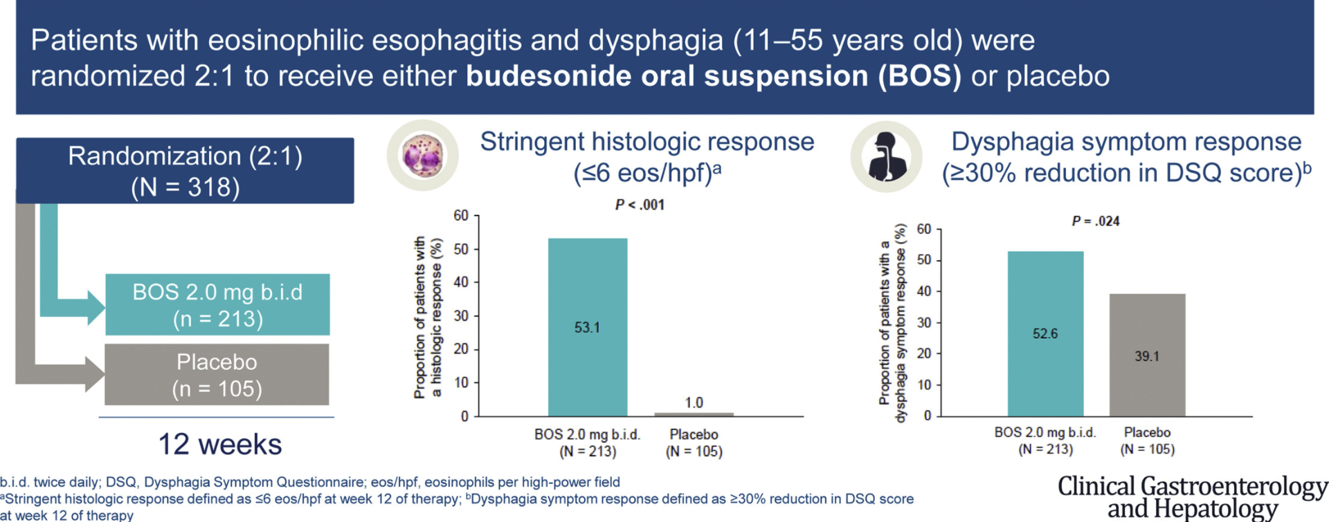Methods: This randomized, double-blind, placebo-controlled trial (SHP621-301; NCT02605837) investigated the safety and efficacy of BOS in patients (11–55 years) with EoE and dysphagia. Patients were randomized 2:1 to 2.0 mg BOS or placebo twice daily (b.i.d.) for 12 weeks (Figure 1). Co-primary endpoints were histologic (peak eosinophil count ≤6 eosinophils/high-powered field [eos/hpf]) and dysphagia symptom (≥30% decrease in symptoms as measured by the Dysphagia Symptom Questionnaire [DSQ]) responses after 12 weeks of therapy. Secondary endpoints included change in DSQ score and change in EoE Endoscopic Reference Score (EREFS) from baseline to final treatment period. Safety was also assessed.