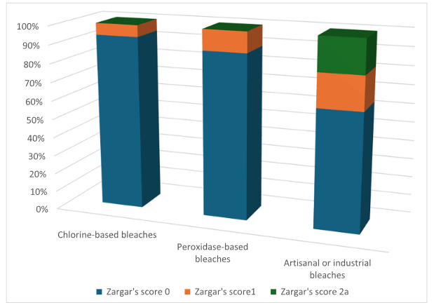 Methods: This prospective observational study was carried out between January 2017 and December 2023. One hundred children with a mean age of 58.7 months were included and divide into three groups. Group 1, children who had ingested household chlorine-based bleach; Group 2, children who had ingested household peroxidase-based bleach; Group 3, children who had ingested artisanal or industrial bleaches.