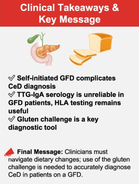 My take: A larger recent study (Chang et al. Pediatrics. 2025;156(3):e2025070897) found that the no-biopsy approach had a significantly lower PPV in their cohort (94.9% overall, and 95.7% in those without T1DM). Thus, in cohorts with lower prevalence of CD, the no-biopsy approach could lead to 2-4% of children being placed unnecessarily on a gluten free diet. As such, it would be good practice to discuss making a diagnosis via endoscopy vs. the no-biopsy approach as part of shared decision-making.