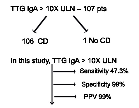 - In those with a high titer (>10xULN), 106 of 107 patients (99%) had celiac disease