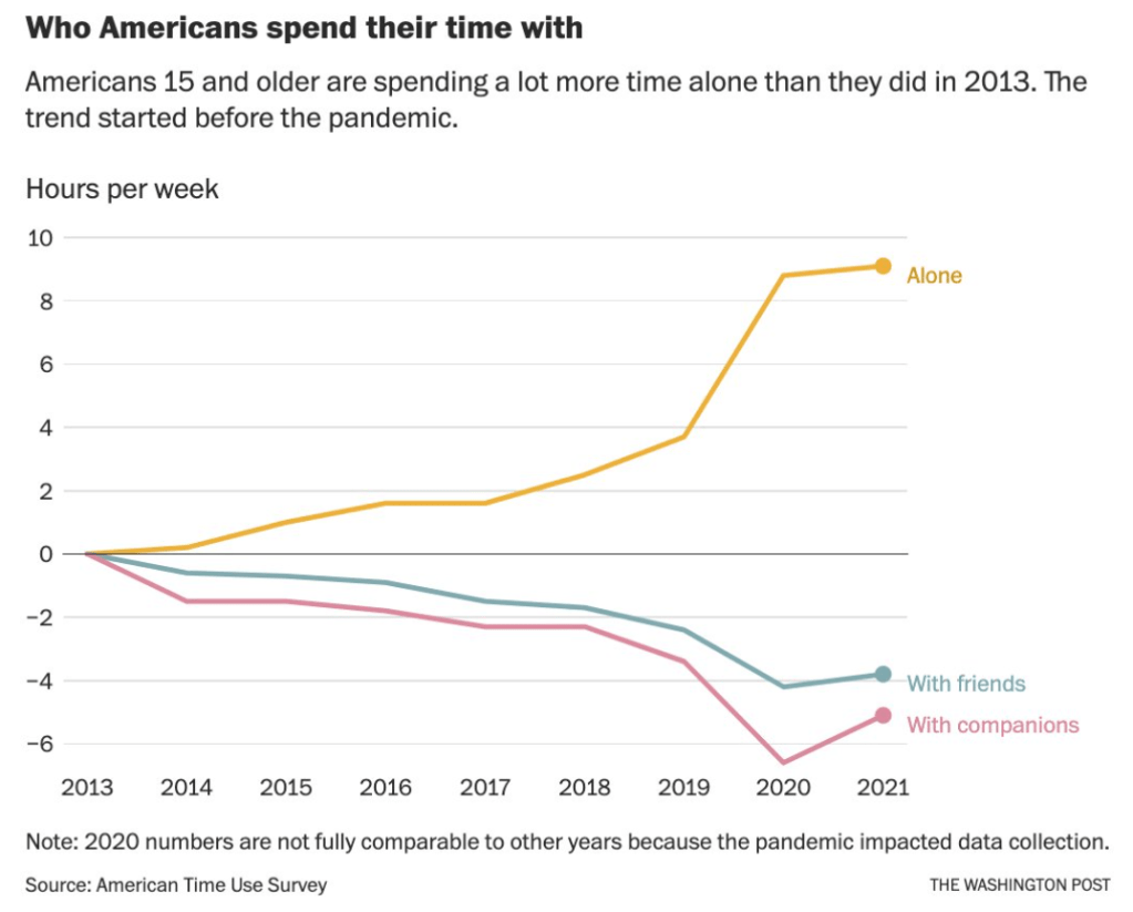 From TheWashington Post, 11/23/22. Opinion Americans are choosing to be alone. Here’s why we should reverse that. “Spending less time with friends is not a best practice by most standards, and it might contribute to other troubling social trends — isolation, worsening mental health (particularly among adolescents), rising aggressive behavior and violent crime. “