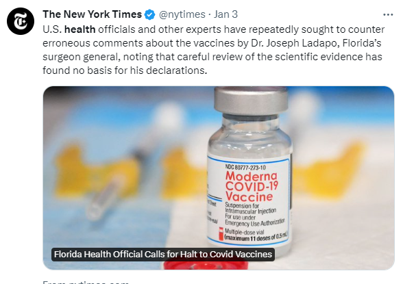 It used to be fairly easy to dismiss Florida’s surgeon general, Dr. Joseph A. Ladapo, as a clownish anti-vaccine quackposing a danger mostly to residents of his home state…Ladapo has moved from promoting useless treatments for COVID-19, such as the drugs hydroxychloroquine and ivermectin, to waging an ever-expanding fact-free campaign against the leading COVID vaccines…