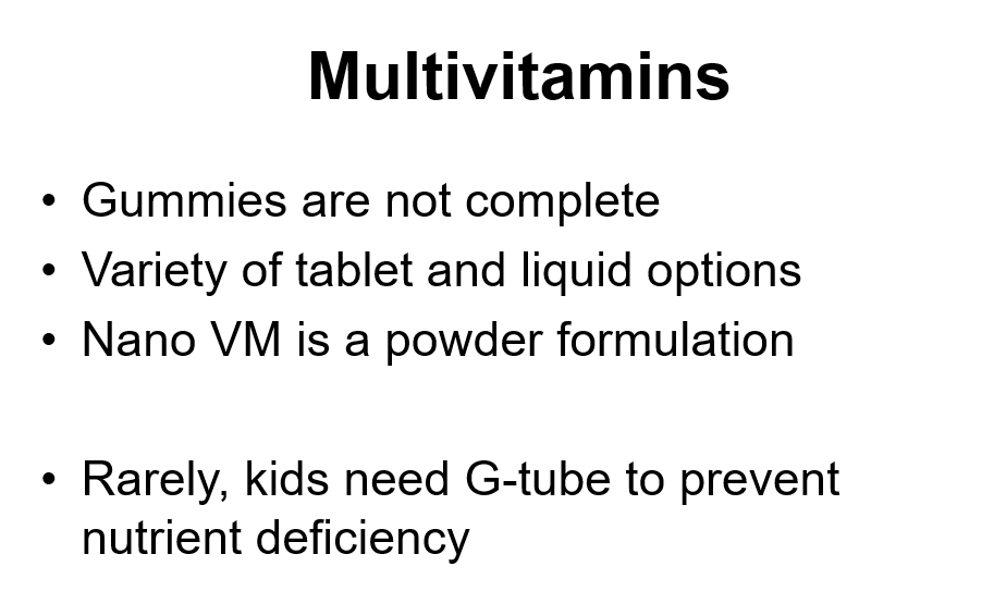 - Vitamins -Gummy vitamins are NOT complete vitamins, Nano VM -minimal taste powder (costly)