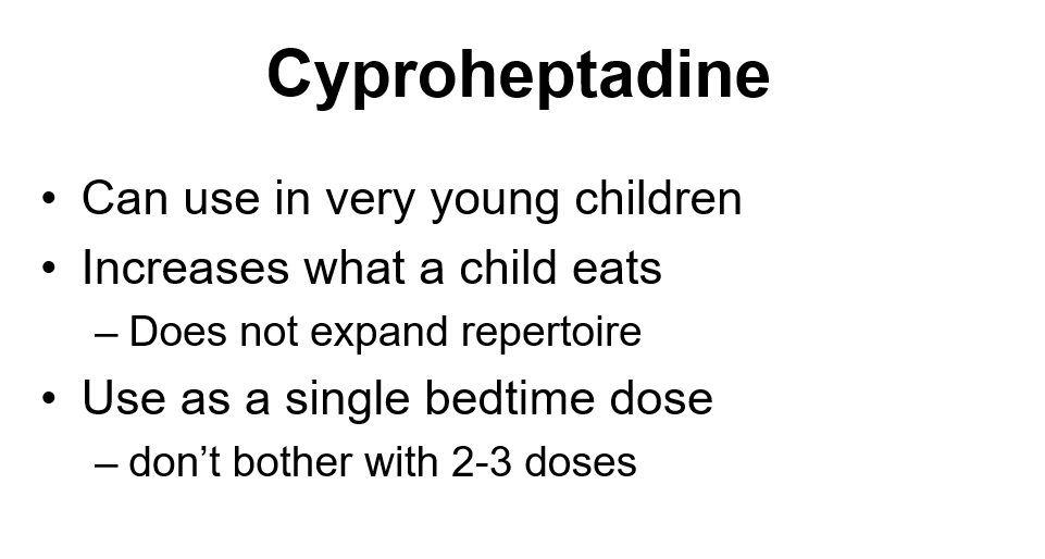 - Cyproheptadine -Dr. Goday prefers single night time dose, usually cycles medicine (2 weeks on, 1 week off), uses as early as 8 months of age. Watch for adverse effects on behavior.