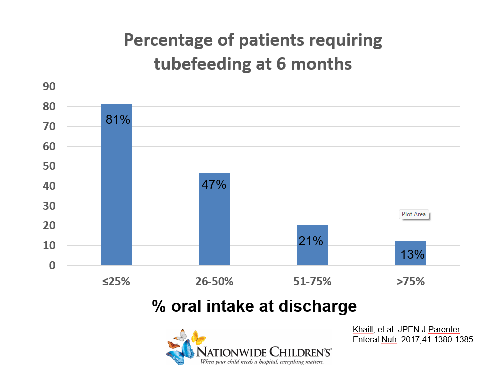 - If taking >75% of feeds orally, only 13% still needing tube feeds 6 months later. If taking <25%, 81% still needing tube feeds 6 months later (needs a GT)