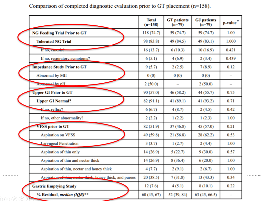 - Pre-op studies are not predictive of who will need GJ feedings vs GT feedings
