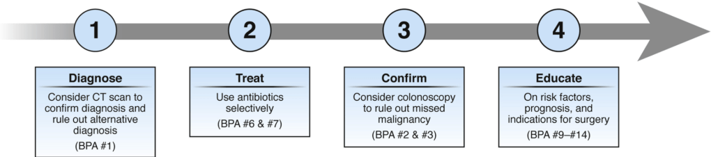 - Best Practice Advice 1: Computed tomography should be considered to confirm the diagnosis of diverticulitis in patients without a prior imaging-confirmed diagnosis and to evaluate for potential complications in patients with severe presentations. Imaging should also be considered in those who fail to improve with therapy, are immunocompromised, or who have multiple recurrences and are contemplating prophylactic surgery in order to confirm the diagnosis and location(s) of disease.