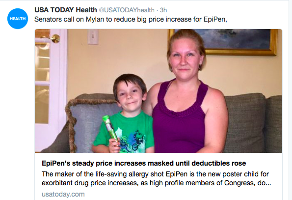 Also, this story has been discussed in NY Times (Epipen & Health Care System Dysfucntion) and USA Today (see below)