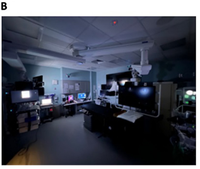 (A) Endoscopy suite under green light. (B) Endoscopy suite under low light.