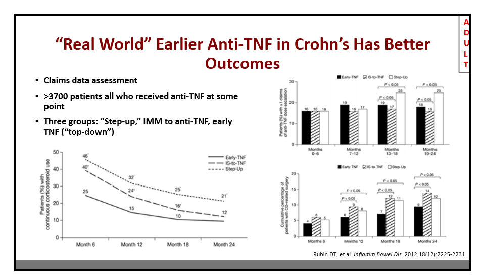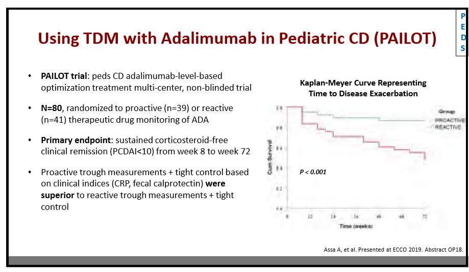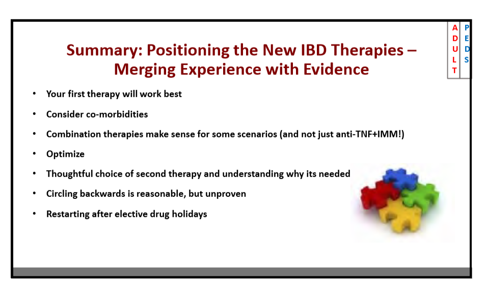 As an aside, while Dr. Rubin is an excellent speaker, my view is that there are so many terrific pediatric IBD specialists, I would favor having a pediatric IBD specialist give this talk at our postgraduate course.  (Some might argue that adult IBD specialists would have more experience with emerging therapies.)