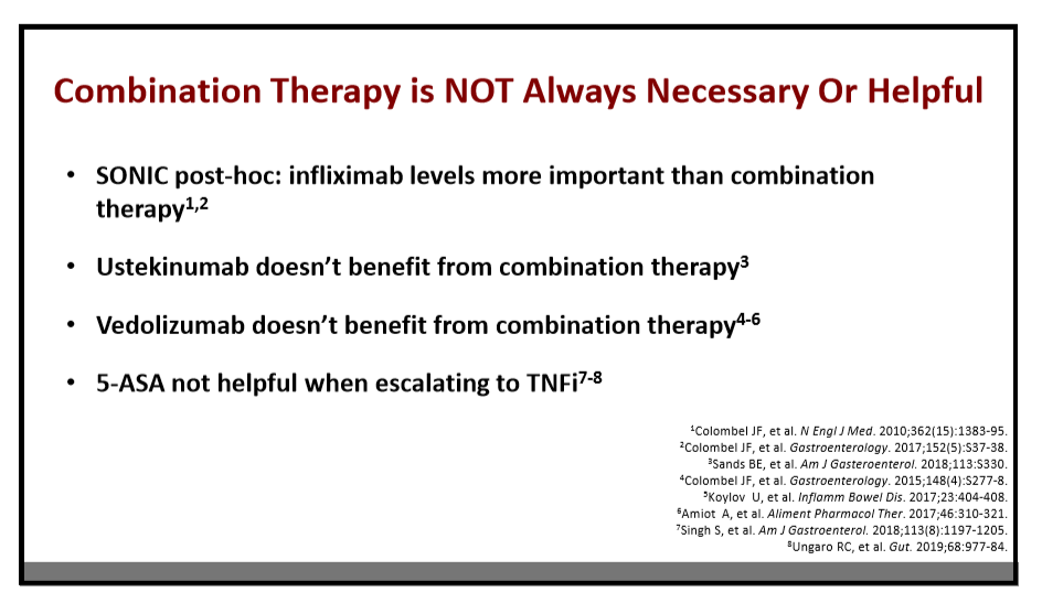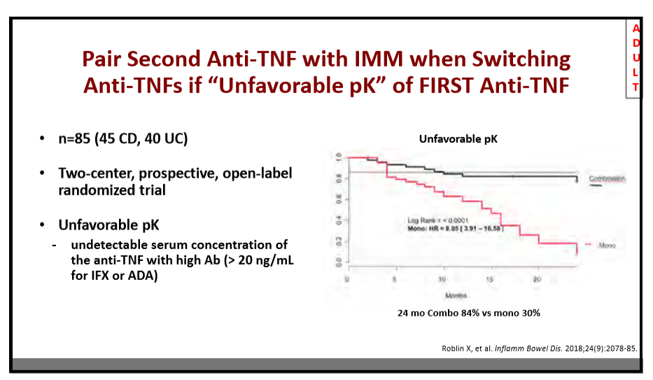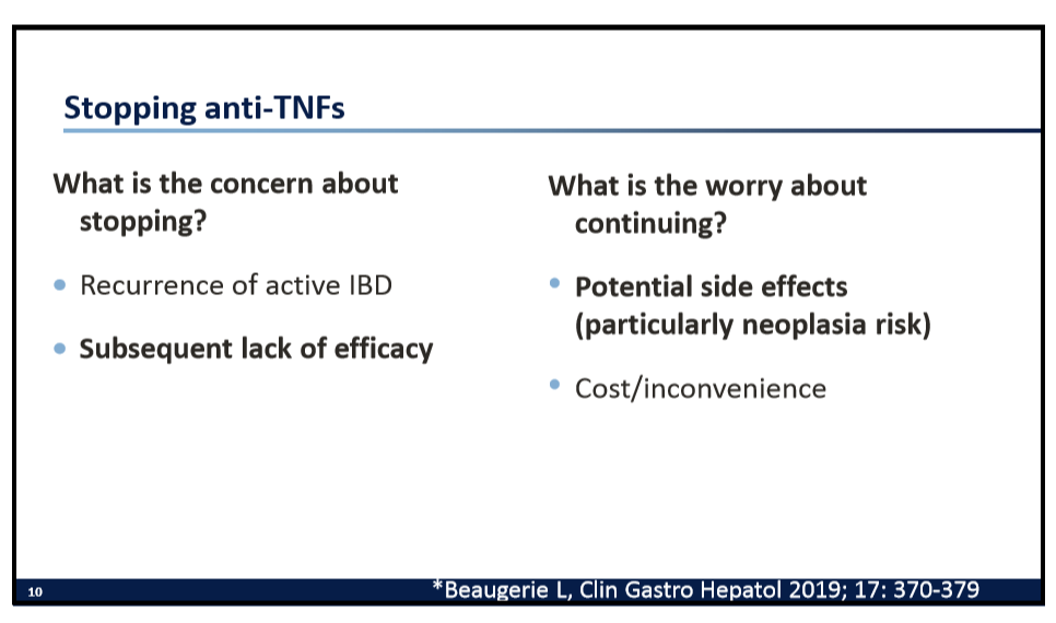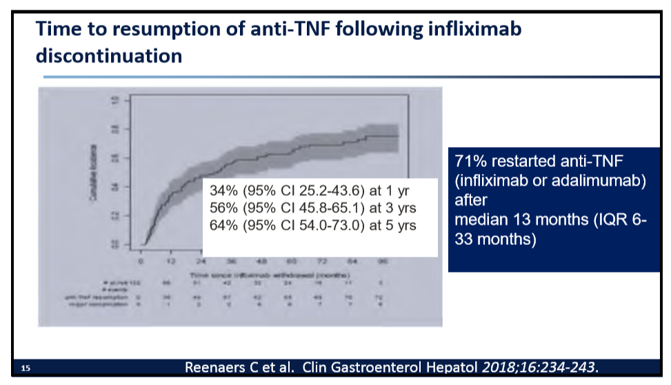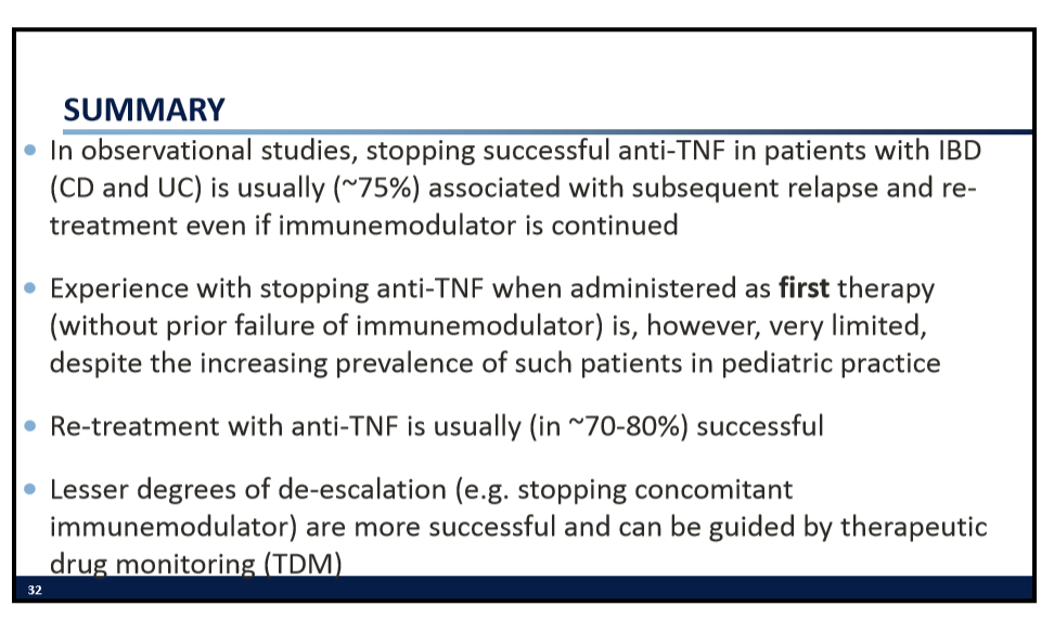 • High rate of relapse when biologic therapy is stopped.  Use of an immunomodulator may reduce the relapse rate when stopping an anti-TNF agent
