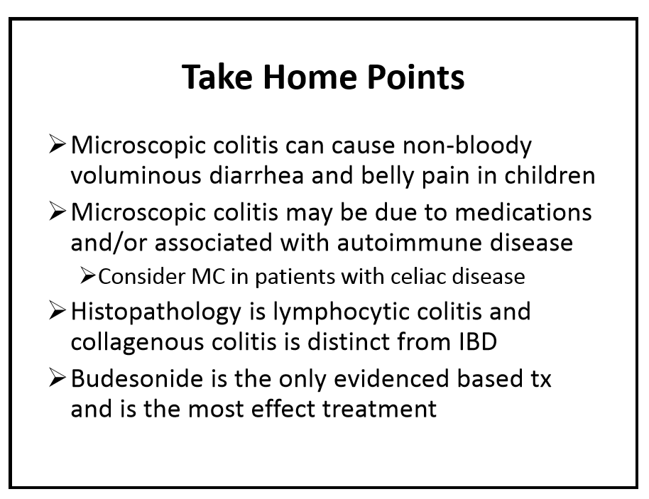 Microscopic Colitis -pediatric prevalence unknown (JPGN 2013;57:557-561). Nonbloody diarrhea with normal-appearance grossly.