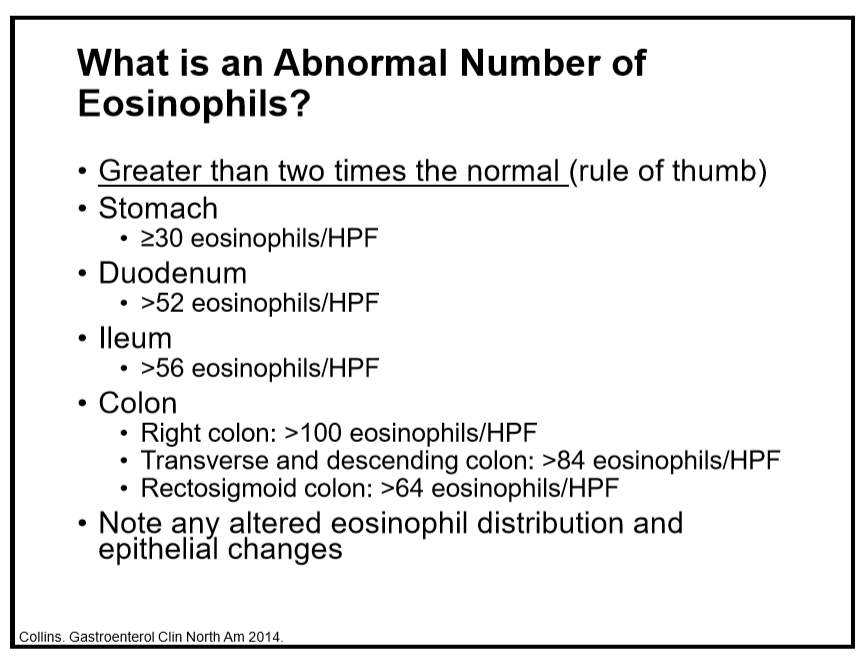 A recent study (Z Kiss et al. JPGN 2018; 67: 6-12) provides more data on normative values for eosinophil counts in the GI tract.  For their report, the authors reviewed 3 databases for a systematic search of the literature. They screened 1316 abstracts but found only 8 articles with complete/relevant data.  Among these 8 articles, data regarding each segment of the GI tract was present in as few as 3 articles and as many as 6 articles. The authors provide confidence intervals (CIs) and prediction intervals (PIs); the latter account for the wider uncertainty due to insufficient data.