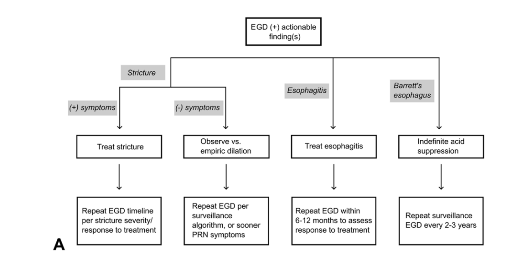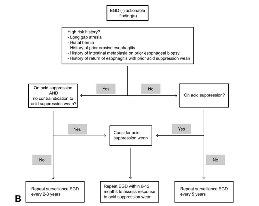- Evidence-Based Algorithm for Surveillance in Esophageal Atresia Patients JL Yasuda et al. J Am Coll Surg 2024; 238: 831-843. The algorithms above suggest that at minimum, EA patients should have endoscopy every 5 years (likely starting between 12-18 months). More frequent endoscopy (every 2-3 years) may be worthwhile in those with risk factors (e.g. long gap EA, hiatal hernia, and prior esophagitis) and follow-up endoscopy is needed sooner if change in therapy (stricture dilation, esophagitis treatment or treatment de-escalation).