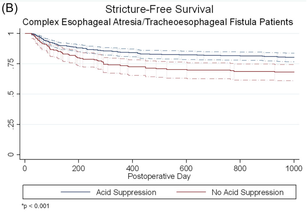 - At 1 year, stricture rate was similar in infants with simple EA/TEF, with or without acid suppression (17.5% vs. 17.0%, p = 0.90)