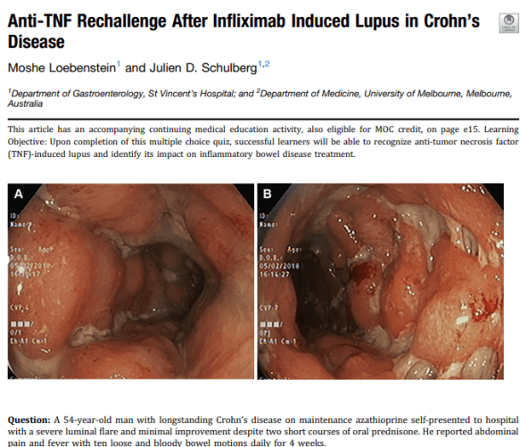 Loebenstein, JD Schulberg. Gastroenterol 2020; 158: 2069-71. This case report describes a successful alternative anti-TNF rechallenge after infliximab induced Lupus in Crohn’s disease. The authors note that in a previous study, 14 of 20 IBD patents with drug-induced lupus secondary to an anti-TNF agent were rechallenged with an alternative anti-TNF agent and 13/14 tolerated rechallenge without recurrent lupus (Inflamm Bowel Dise 2013; 19: 2778-86).