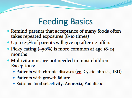 - Older kids with poor growth—1st steps: avoid juices, avoid grazing (no feeding outside mealtimes except water)/scheduled meals & snacks, and probably cyprohepatadine. Management: Have child sit at table for 20 minutes, feedings every 3 hours, and avoid force feeding.