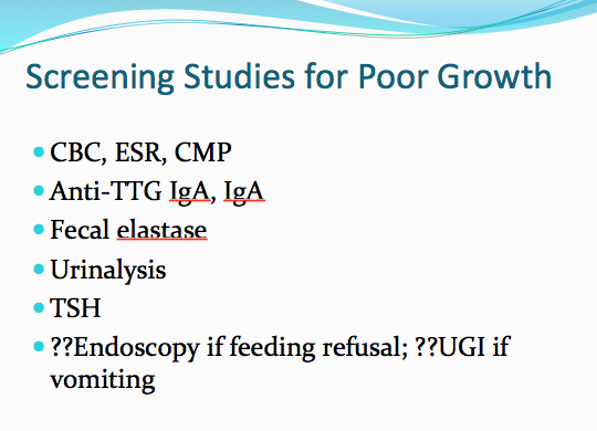 - Older kids with poor growth –screening labs: TTG IgA, IgA, CBC, ESR, CMP, TSH, Urinalysis, and possibly fecal elastase.