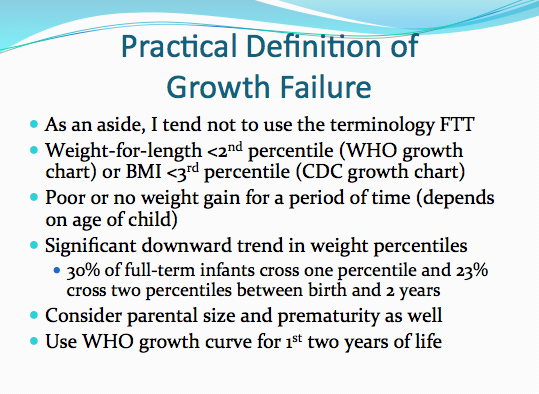- Weight-for-length <2nd percentile (WHO growth chart for kids <2 yrs) or BMI ❤rd percentile. BMI more problematic in infants because of accuracy of length. If any inaccurate measurement, BMI value squares the length value; thus exponentially inflating any discrepancy.