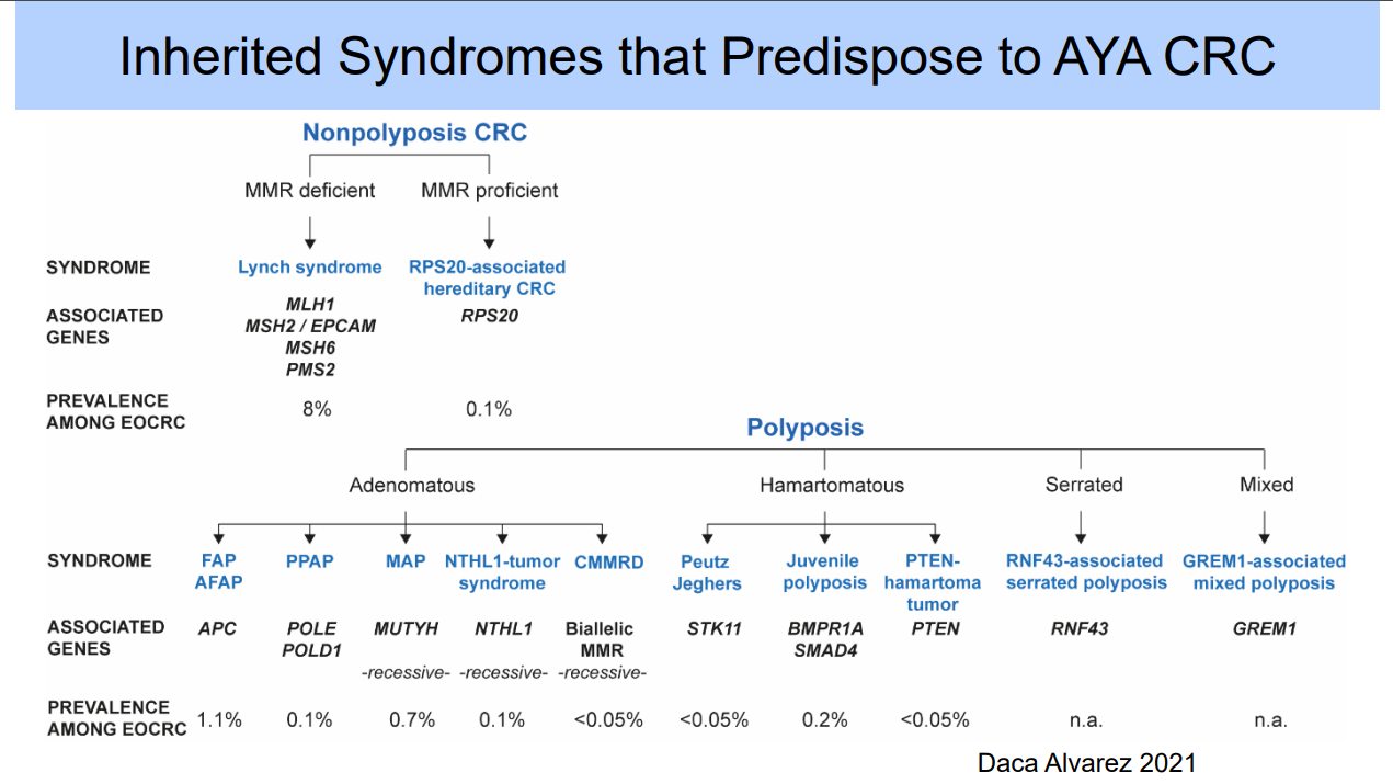 Table 1 lists the syndrome, the mutated gene (s), and recommended screening (onset & interval). The article and table provide more nuance/guidance but the basic recommendations are noted as follows: