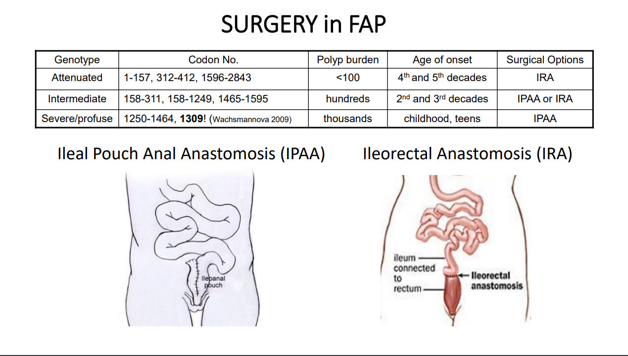 Recommendation 4: Colectomy is necessary to prevent CRC in adulthood. Decision on the timing for colectomy should be determined by polyp burden and characteristics of colonic adenomas in the context of social, personal, and educational factors. IRA or IPAA have their merits and disadvantages and many factors impact on the choice of surgery. The choice should be based on patient phenotype (rectal and colonic burden) and genotype, at the discretion of the surgeon. (weak recommendation, low-quality evidence, consensus agreement 100%)