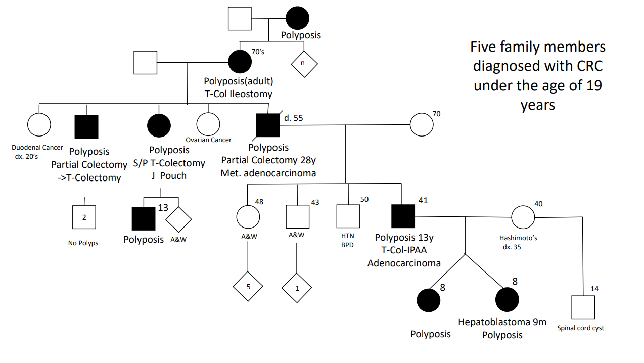 Case#2 presented 8 yo twins. Aggressive management was indicated as 5 family members developed colorectal cancer prior to age 20 years.