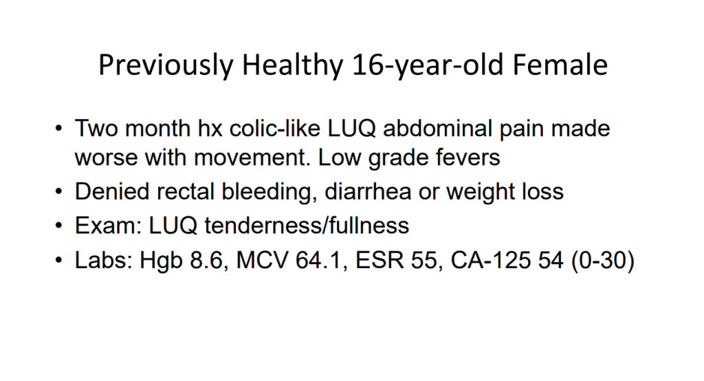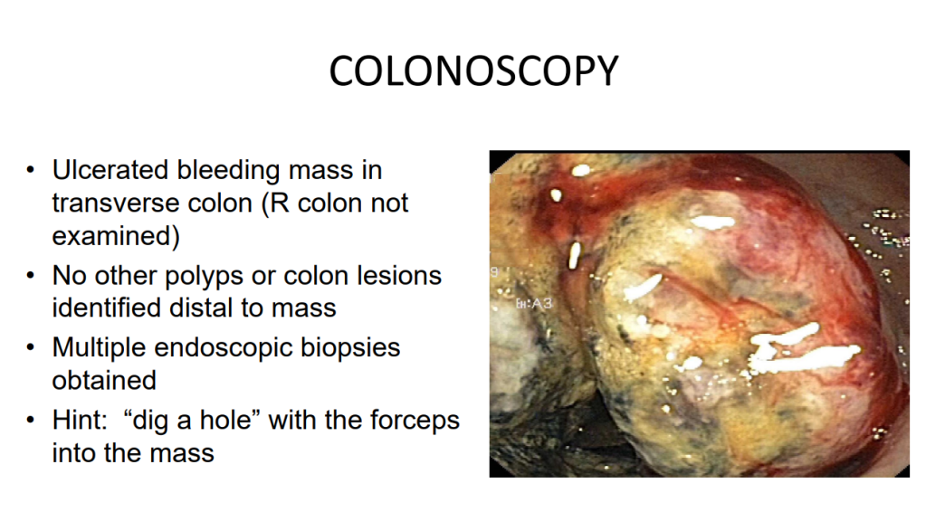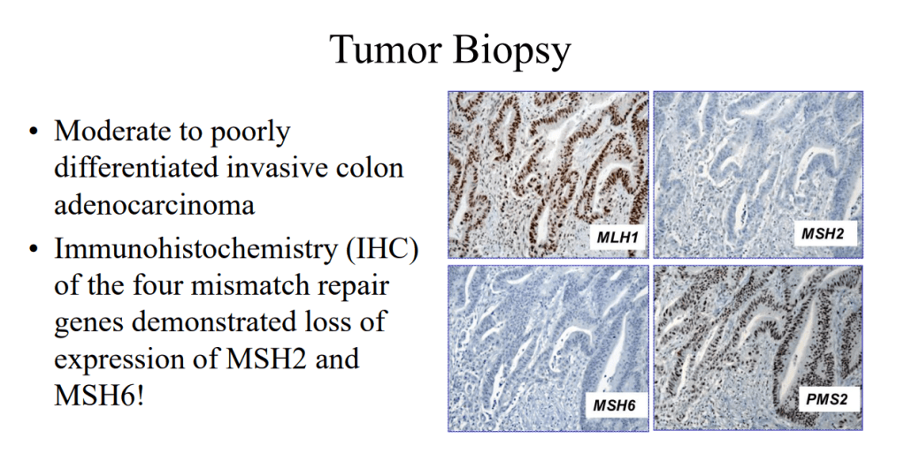 Case#3 presented a 16 yo with anemia and pain who was found to have a colonic mass related to mismatch repair mutation. Dr. Erdman indicated that obtaining adequate tissue for a diagnosis (“dig a hole”) is important. (As an aside, other colleagues have had the experience of tumors which were highly vascular and it is important to keep this possibility in mind)