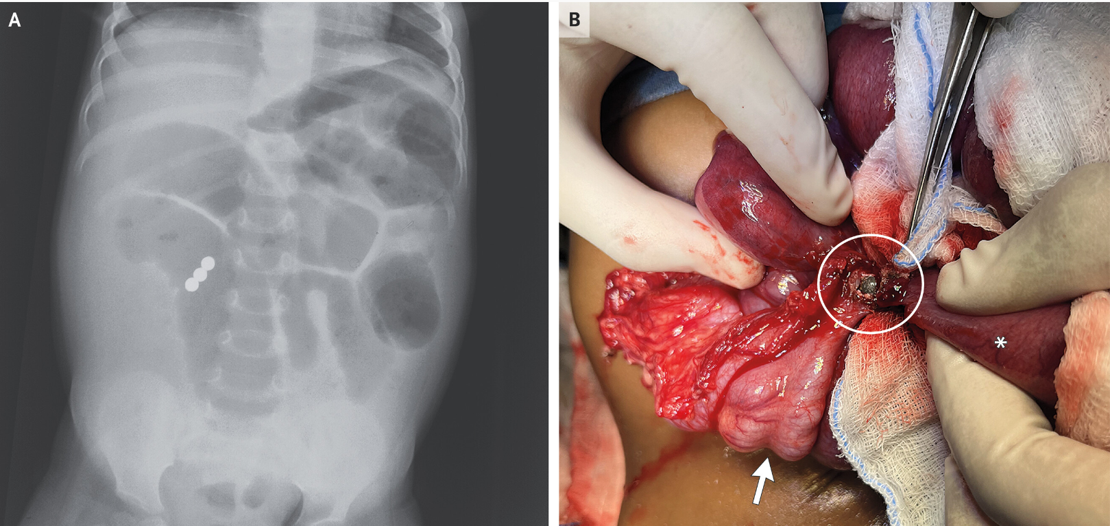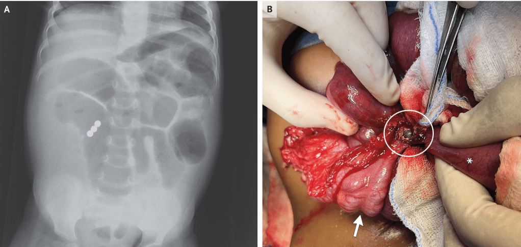 A previously healthy 18-month-old girl was brought to the emergency department with sudden-onset abdominal distention that had been preceded by 3 days of diarrhea and 1 day of vomiting…an emergency exploratory laparotomy was performed. An ileocecal fistula (Panel B, circle) created by the union of three magnetic beads was identified (arrow, cecum; asterisk, ileum), and dilated loops of bowel were noted. The bowel was repaired. The patient was discharged after five days.