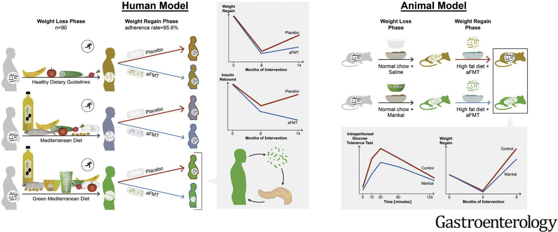 In this randomized controlled trial with 90 participants, autologous FMT (aFMT) significantly attenuated weight regain in the green-Mediterranean group (aFMT, 17.1%, vs placebo, 50%; P = .02) and improved insulin resistance: insulin rebound (aFMT, –1.46 ± 3.6 μIU/mL vs placebo, 1.64 ± 4.7 μIU/mL; P = .04) (Graphical abstract below)