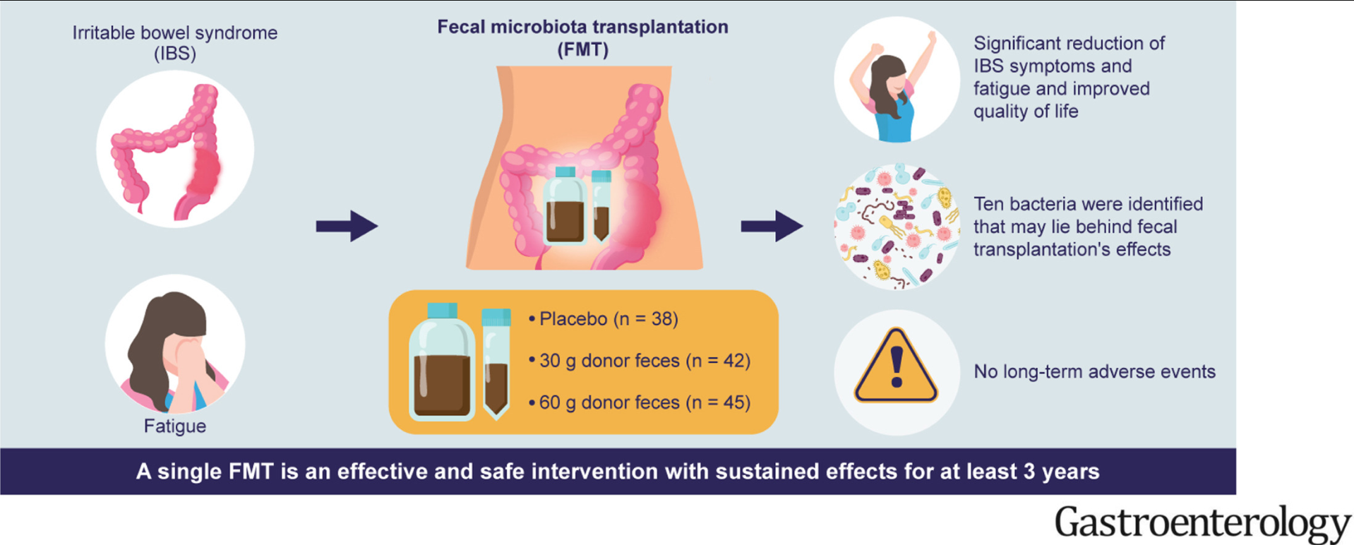 Background: “Fecal microbiota transplantation (FMT) might be a promising treatment for IBS, and this has been investigated in 7 randomized controlled trials (RCTs). 2 In 4 of these, FMT reduced symptoms and improved the quality of life of patients with IBS, whereas no effects were indicated in the other 3. 2 The difference in these results was likely because of differences in the protocols used, the selected donors, the cohort of treated patients, the fecal transplant dose, and the route by which the transplant was administrated.2“
